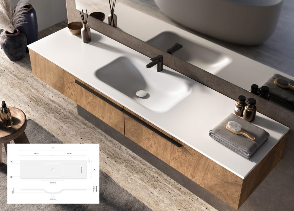 Sienna: Vanity top for furniture mounting, with lengths from 750 to 2900 mm, suitable for individual bathroom solutions.