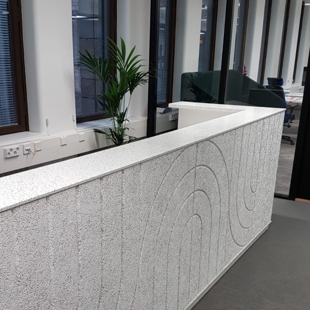 Kerrock is perfectly suited to a wide range of environments: reception areas and front desks, conference tables, work surfaces, restrooms and kitchens, wall cladding, and furniture fronts. Thanks to its durability and recyclability, it is also a sustainable choice that aligns with environmental standards.